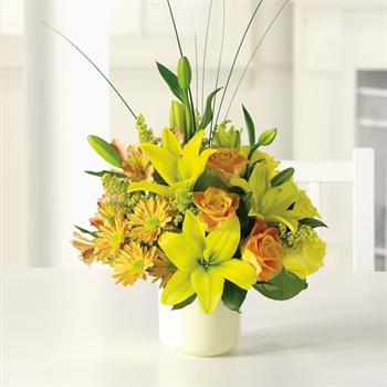 Bright-yellow lilies and fire-orange roses awaken the senses with sunny greetings for any occasion. Brighten someone's day today!