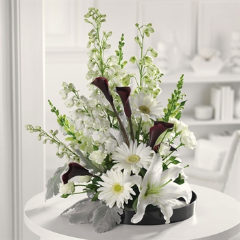 The utmost in contemporary elegance. A bright white lily, Gerbera daisies and snapdragons surround five mystical black calla lilies.