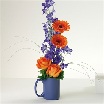 Start the day off right with this burst of orange roses, miniature Gerbera daisies, blue Belladonna delphinium and bear grass in a ceramic mug.
